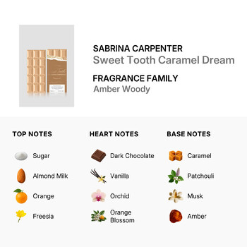 Introducing the delightful world of Sweet Tooth Caramel Dream, an enchanting fragrance crafted exclusively for ladies by the renowned design house of Sabrina Carpenter. Launched in 2023, this captivating scent is a harmonious blend of sweet and woody aromas that will transport you to a dreamy wonderland.