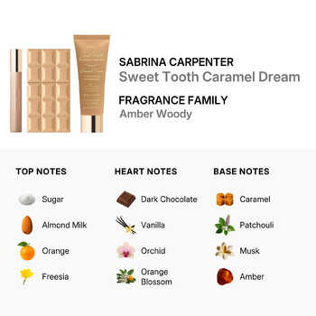 Part of the Amber Woody fragrance family, Sweet Tooth Caramel Dream opens with an irresistible mix of sweet sugar, almond milk, juicy orange, fresh freesia, and a hint of zesty lemon. These top notes create a bright, playful introduction that instantly lifts your mood.