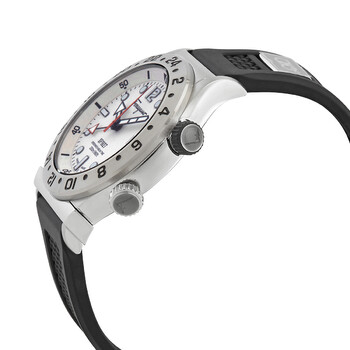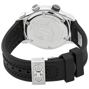 Silver-tone stainless steel case with a black rubber strap. Silver-tone stainless steel bezel. White dial with index hour markers. Arabic numeral marks the 12 o'clock position. Minute markers around the outer rim. Dial Type: Analog. Luminescent hands and markers. Date display at the 3 o'clock position. Quartz movement. Scratch resistant sapphire crystal. Screw down crown. Solid case back. Round case shape, case size: 44 mm. Deployant buckle clasp. Water resistant at 200 meters / 660 feet. Functions: date, GMT, second time zone, hour, minute, second. 1927 Series. Sport watch style. Watch label: Swiss Made. Salvatore Ferragamo 1927 GMT Quartz White Dial Men's Watch SFMZ00122.