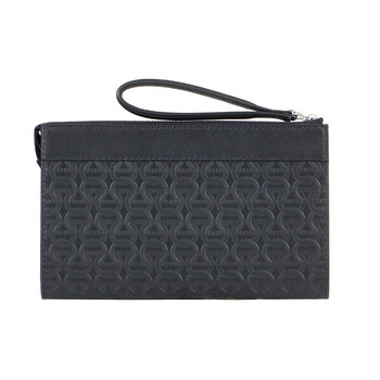 Salvatore Ferragamo Men's Clutch. SKU: 24A421 723757. Barcode: 8057453452667. Color: Black. Size: H: 6.1" x L: 9.8" x W: 0.7". Salvatore Ferragamo Black Embossed Gancini Document Holder. Featuring a top zip fastening, all over Gancini pattern embossed in the calfskin leather, wrist strap, and a double lined interior. Made in Italy.