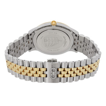 Silver-tone stainless steel case with a two-tone (silver-tone and gold-tone) stainless steel bracelet. Fixed gold-tone stainless steel bezel. Silver dial with gold-tone hands and index-Arabic numeral hour markers. Arabic numeral marker appears at the 3, 6, 9 and 12 o'clock positions. Minute markers around the outer rim. Dial Type: Analog. Luminescent hands. Date display at the 6 o'clock position. Quartz movement. Scratch resistant sapphire crystal. Pull / push crown. Solid case back. Round case shape, case size: 40 mm. Deployment with push button release clasp. Water resistant at 50 meters / 165 feet. Functions: date, hour, minute, second, moophase. Duo Moonphase Series. Dress watch style. Watch label: Swiss Made. Salvatore Ferragamo Duo Moonphase Quartz Silver Dial Men's Watch SFMO00222.