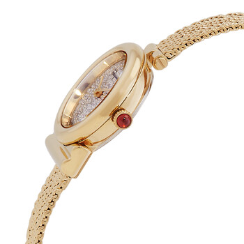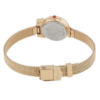 Gold-tone stainless steel case and bracelet. Fixed gold-tone stainless steel bezel. Silver pave dial with gold-tone hands. Dial Type: Analog. Quartz movement. Scratch resistant sapphire crystal. Pull / push crown. Solid case back. Round case shape, case size: 22 mm. Water resistant at 30 meters / 100 feet. Functions: hour, minute. Gancini Series. Casual watch style. Watch label: Swiss Made. Salvatore Ferragamo Gancini Diamond Quartz Ladies Watch SFUY00322.