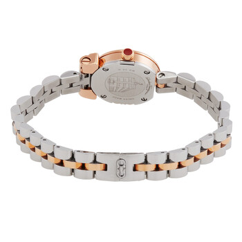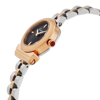 Rose gold-tone stainless steel case with a two-tone (silver-tone and rose gold-tone) stainless steel bracelet. Fixed rose gold-tone stainless steel bezel. Black dial with rose gold-tone hands and index hour markers. Dial Type: Analog. Quartz movement. Scratch resistant sapphire crystal. Pull / push crown. Solid case back. Round case shape, case size: 22.5 mm. Water resistant at 30 meters / 100 feet. Functions: hour, minute. Gancini Series. Casual watch style. Watch label: Swiss Made. Salvatore Ferragamo Gancini Quartz Black Dial Two-Tone Ladies Watch SFKK00923.