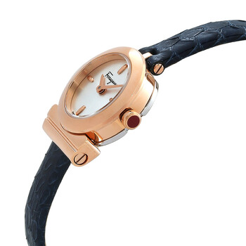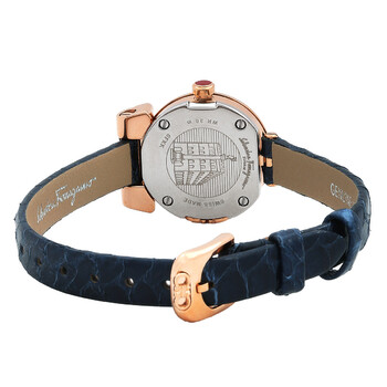 Rose gold-tone stainless steel case with a blue leather strap. Fixed rose gold-tone stainless steel bezel. Silver dial with rose gold-tone hands and index hour markers. Dial Type: Analog. Quartz movement. Scratch resistant sapphire crystal. Pull / push crown. Solid case back. Round case shape, case size: 22.5 mm. Buckle clasp. Water resistant at 30 meters / 100 feet. Functions: hour, minute. Gancini Series. Casual watch style. Watch label: Swiss Made. Salvatore Ferragamo Gancini Quartz Silver Dial Ladies Watch SFKK00623.