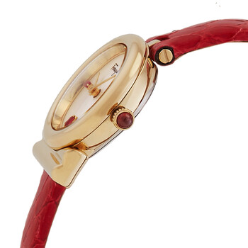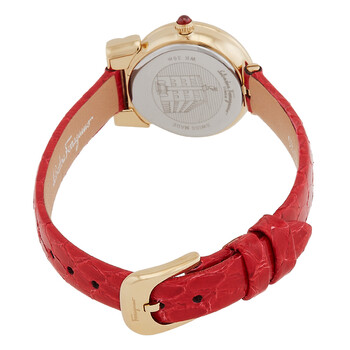 Gold-tone stainless steel case with a red leather strap. Fixed gold-tone stainless steel bezel. Silver dial with gold-tone hands and ruby hour markers. Dial Type: Analog. Quartz movement. Scratch resistant sapphire crystal. Pull / push crown. Solid case back. Round case shape, case size: 22 mm. Buckle clasp. Water resistant at 30 meters / 100 feet. Functions: hour, minute. Gancini Series. Casual watch style. Watch label: Swiss Made. Salvatore Ferragamo Gancini Quartz Silver Dial Ladies Watch SFUY00122.