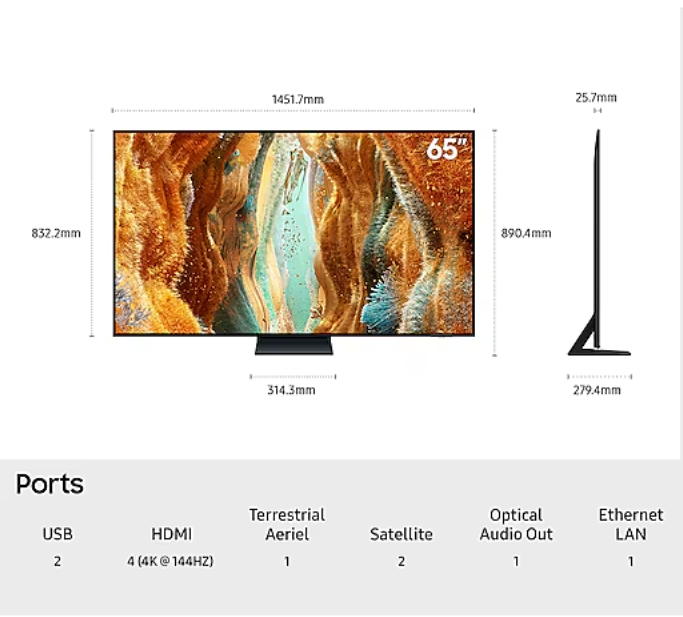 - 65-დუიმიანი Neo QLED ეკრანი შთამბეჭდავი 8K (7680 x 4320) რეზოლუციით.