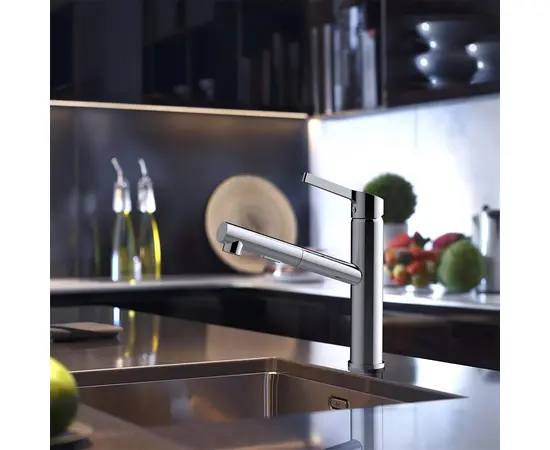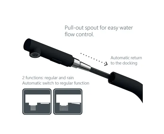 სამზარეულოს შემრევი გამოსაწევი ხორთუმით გთავაზობთ მაღალ მოქნილობას ტაფების, ქვაბების და ნიჟარის ყველა კუთხის გაწმენდისას. მოძრაობის ფართო დიაპაზონის გამო, შეგიძლიათ შეავსოთ ნებისმიერი ტიპისა და ზომის კონტეინერები შეუზღუდავად.