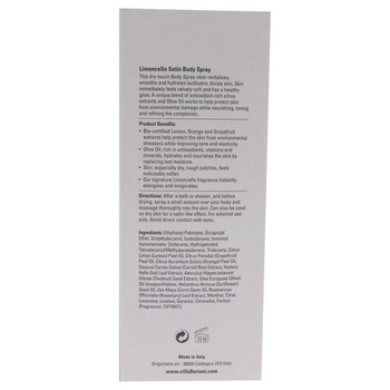 This dry-touch body spray hydrates and revitalizes lacklustre, thirsty skin, leaving it with a soft, smooth, and satin finish. A unique plant extract blend rich in antioxidants helps to tone, refine, and invigorate the complexion. Design house: Villa Floriani. Series: Satin Body Spray - Limoncello. Gender: Ladies. Category: Bath & Body. Beauty group: Body. Size: 5.07 oz. SKU: I0106603. Barcode: 8032758342806. Satin Body Spray - Limoncello by Villa Floriani for Women - 5.07 oz Body Spray.