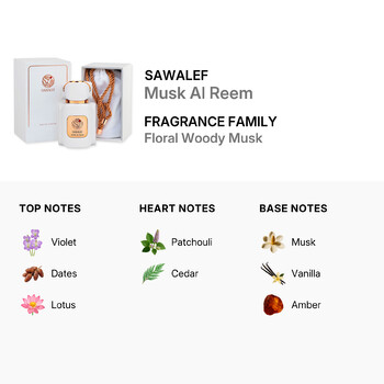 Musk Al Reem opens with intriguing top notes of violet, dates, and lotus, creating a delicate yet captivating initial impression. The heart notes feature patchouli and cedar, adding a unique earthy, woody depth to the fragrance. The perfume settles into a warm and comforting base of musk, vanilla, and amber. This intricate blend makes Musk Al Reem a standout in the Floral Woody Musk fragrance family.