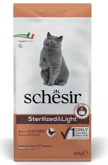 Schesir, 10 კგ. მშრალი საკვები ჭარბწონიანი სტერილური კატებისთვის, ქათმით
