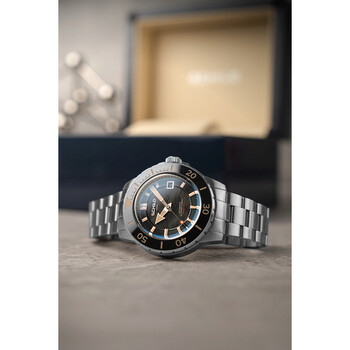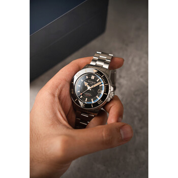 Silver-tone stainless steel case and bracelet. Uni-directional rotating black stainless steel bezel. Black dial with silver-tone hands and index hour markers. Minute markers around the outer rim. Dial Type: Analog. Luminescent hands and markers. Date display at the 3 o'clock position. AS - 5203 automatic movement. Scratch resistant sapphire crystal. Screw down crown. Solid case back. Round case shape, case size: 43 mm, case thickness: 15 mm. Band width: 20 mm, band length: 8 inches. Fold over clasp with a safety release. Water resistant at 200 meters / 660 feet. Functions: date, hour, minute, second. Hermann Series. Casual watch style. Watch label: Swiss Made. Schild Hermann Automatic Black Dial Men's Watch SC-1016-11.
