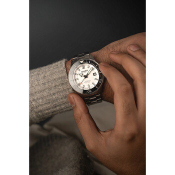 Silver-tone stainless steel case and bracelet. Uni-directional rotating black stainless steel bezel. White dial with black hands and index hour markers. Minute markers around the outer rim. Dial Type: Analog. Luminescent hands and markers. Date display at the 3 o'clock position. AS - 5203 automatic movement. Scratch resistant sapphire crystal. Screw down crown. Solid case back. Round case shape, case size: 43 mm, case thickness: 15 mm. Band width: 20 mm, band length: 8 inches. Fold over clasp with a safety release. Water resistant at 200 meters / 660 feet. Functions: date, hour, minute, second. Hermann Series. Casual watch style. Watch label: Swiss Made. Schild Hermann Automatic White Dial Men's Watch SC-1016-55.