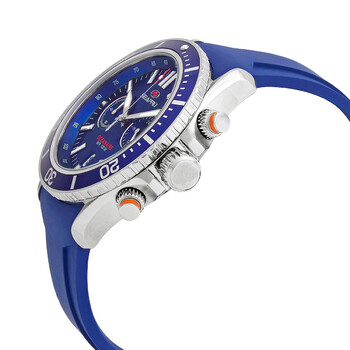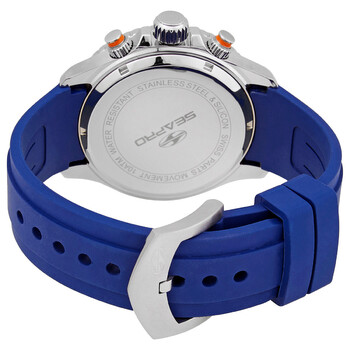 Stainless steel case with a blue silicone strap. Fixed stainless steel bezel with an inlaid blue ring. Blue dial with luminous silver-tone hands and index hour markers. Minute markers. Tachymeter markings around the outer rim. Dial Type: Analog. Luminescent hands and markers. Date display at the 6 o'clock position. Chronograph - two sub-dials displaying: 60 second and 30 minute. Quartz movement. Scratch resistant mineral crystal. Pull / push crown. Solid case back. Round case shape. Case size: 45 mm. Case thickness: 14 mm. Band width: 22 mm. Tang clasp. Water resistant at 100 meters / 330 feet. Functions: chronograph, tachymeter, date, hour, minute, second. Thrash Series. Fashion watch style. Seapro Thrash Chronograph Quartz Blue Dial Men's Watch SP0332.