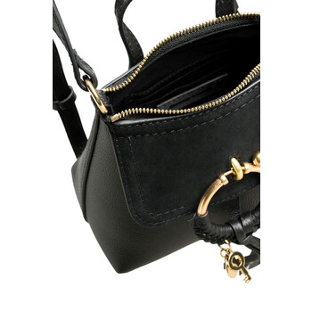 See By Chloe Ladies Backpack. SKU: CHS23SSB92330001. Color: Black. Size: 7.25" W x 6.5" H x 4" D. See By Chloe Black Joan Backpack. A backpack featuring a leather and suede exterior with twill lining, a top zipper closure, a spacious main compartment, three interior card slots, and a leather-wrapped brass ring detail accented with a tassel and logo charm.