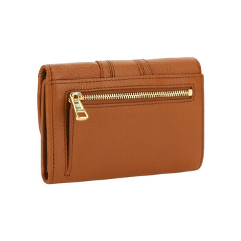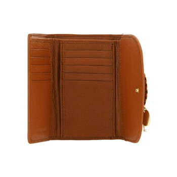 See By Chloe Ladies Wallets. SKU: CHS17WP783305242. Color: Caramel. Size: W 5.5" x H 3.7" x D 0.6". This compact wallet in grained goatskin features a magnetic snap button closure, a gold brass O-ring with braided detail, a keychain with a gold-tone "See by Chloe" engraved medal, 10 card slots, three flat pockets, a bill compartment, an exterior zippered pocket, and a cotton canvas lining. 100% Leather.