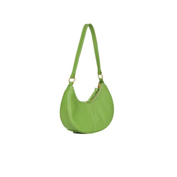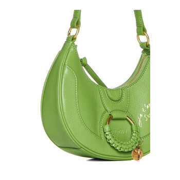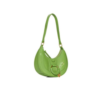 See By Chloe Ladies Shoulder Bag. Hana series. SKU: CHS23ASC1730536Z. Color: Green. Size: W: 8.7" x H: 6.7" x D: 2.4". See By Chloe Hana Half-Moon Leather Shoulder Bag. The Hana half-moon bag in grained goatskin features a chic, minimal silhouette perfect for day-to-evening wear, with a braided gold brass O-ring, a gold-tone engraved "See By Chloe" medal and key, a zippered top closure, a single main compartment, and a short non-removable, non-adjustable strap, all lined with cotton canvas. Material: Goatskin.