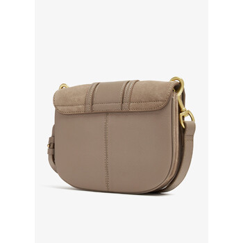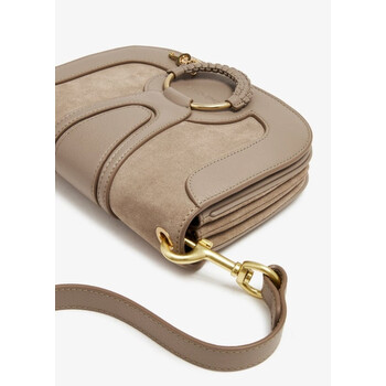 See By Chloe Ladies Shoulder Bag. SKU: CHS18AS896417. Color: Grey. Size: 8.7"W x 2.8"D x 7.1"H. The Hana shoulder bag, crafted from cowhide and suede cowhide, features a thin adjustable strap for cross-body or long shoulder wear, a magnetic snap button closure, two large compartments, a central flat compartment, a card slot, and a removable strap, accented with a braided gold brass O-ring, gold brass finish, and a cotton canvas lining. Max. strap length: 21.3". Material: Leather, Suede.
