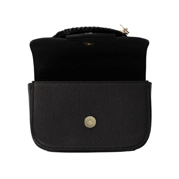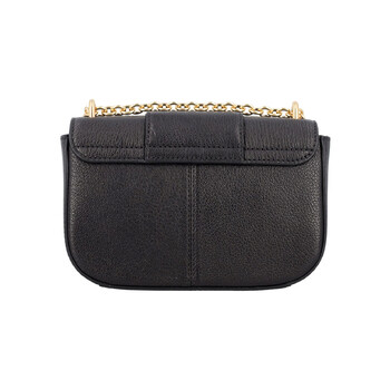 See By Chloe Ladies Shoulder Bag. SKU: CHS22ASB79305001. Color: Black. Size: 7" W x 4.25" H x 2" D. See By Chloe Hana Leather Chain Shoulder Bag. The Hana bag features a leather exterior with a twill lining, a flap top with a magnetic button closure, and a front gold-tone braided O-ring, along with a main compartment, an interior card slot, a slip pocket, a gold-tone engraved See By Chloe charm and key, and a gold-tone chain strap with leather reinforcement. 100% Leather.