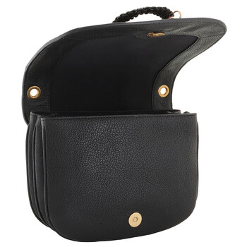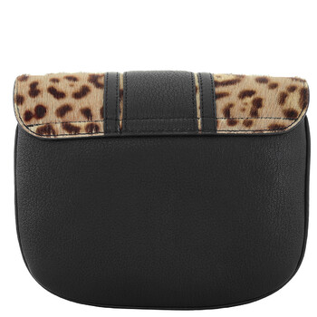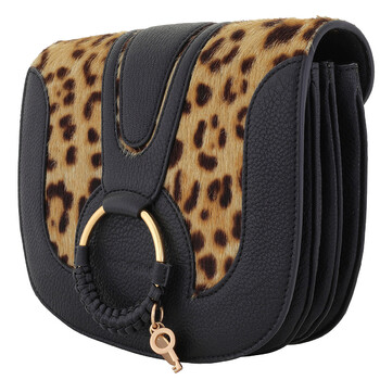 See By Chloe Ladies Shoulder Bag. SKU: CHS19AS896609001. Color: Black. Size: 8.66"W x 2.75"D x 7". See By Chloe Hana SBC Leopard Print Shoulder Bag. The Hana shoulder bag features a 20.5" drop adjustable and removable crossbody strap, a magnetic snap closure, two interior compartments with a slip pocket, signature ring hardware at the front, and a leopard print detail on the flap, crafted from dyed real calf hair.