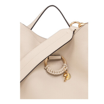 See By Chloe Ladies Top Handle Bag. SKU: CHS23USB90. Color: Beige. Size: Height: 18cm x Width: 22cm. See by Chloe Joan Small Leather Shoulder Bag. The Joan Small Shoulder Bag, crafted from leather, features a magnetic snap closure and a signature leather-covered ring adorned with logo-embossed charms. Designed for versatility, it includes a detachable and adjustable strap, two internal straps, a slip pocket, and gold-tone metal hardware for an elegant finishing touch. Material: Grained Cowhide Leather.
