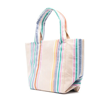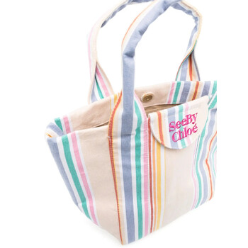 See By Chloe Ladies Tote. SKU: CHS23USB62D16276. Color: Tan. Size: 15.75” L x 11"H x 6” D. See By Chloe Laetizia Striped Tote Bag. This cotton tote features a vertical stripe print, an embroidered front logo, a magnetic fastening, two top handles, and a spacious main compartment. Outer: Cotton 100%.