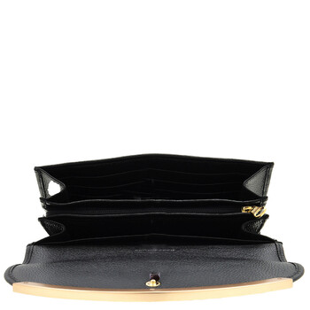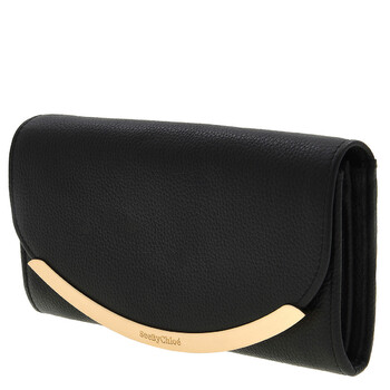 See By Chloe Ladies Wallets. SKU: CHS17WP582349001. Color: Black. Size: W 7.68 x H 3.94 x D 1.18 inches. See By Chloe Lizzie Long Leather Wallet. This wallet, crafted from grained cowhide leather, features a curved See by Chloe-engraved gold brass bar on the front flap, a snap button closure, two main compartments, a zippered pocket with two sections and two flat pockets, twelve card slots, and an external flat pocket. Material: 100% Cow Leather.