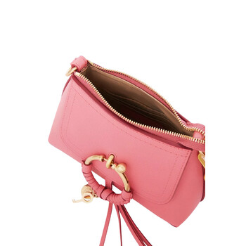See By Chloe Ladies Shoulder Bag. SKU: CHS24US975E416O1. Color: Pushy Pink. Size: W: 7.5" x H: 5.1" x D: 3.3". See By Chloe Mini Joan Leather Shoulder Bag. This small grain cowhide bag features a zippered top closure, a removable handle, a long strap for crossbody, shoulder, or hand carry, a main compartment, a front flat pocket with an oversized round hook clasp, three interior card slots, gold brass finishes, a "See By Chloe" embossed logo, and a cotton canvas lining. Material: 100% Leather.
