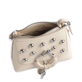 See By Chloe Ladies Shoulder Bag. SKU: CHS24SS975C8824H. Barcode: 7614027150049. Color: Beige. Size: Width : 19 cm x Height : 13 cm x Depth : 8.5 cm. See by Chloe Mini Joan Leather Shoulder Bag. This mini bag in grained cowhide leather is adorned with studded details, offering a chic yet edgy look. Designed for versatility, it can be carried by hand, worn over the shoulder, or styled as a crossbody with its removable handle and long strap. The bag features a secure zipped top closure, a front flap pocket with a signature oversized ring detail, and a spacious main compartment. Inside, three card slots provide added organization. Finished with silver brass hardware and a cotton canvas lining, this compact accessory blends practicality with signature style. 100% Cowhide leather.