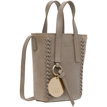 See By Chloe Ladies Tote. SKU: CHS23USC05C9923W. Color: Grey. Size: 6.7" W x 7.1" H x 2.4" D. See By Chloe Mini Tilda Tote Bag. This tote bag features a leather and suede exterior with a twill lining, a top strap with a magnetic button closure, a spacious main compartment, an embossed tonal See By Chloe logo on the front, a detachable gold-tone charm with an embossed knotted detail, whipstitch trim, a 21" drop shoulder strap, and a 3" drop top handle. Material: Leather and Suede.