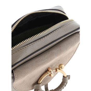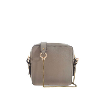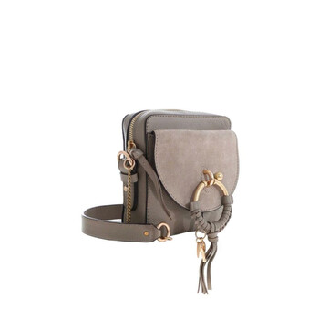 See By Chloe Ladies Shoulder Bag. SKU: CHS19SS99433023W. Color: Grey. Size: W 5.7" x H 5.7" x D 1.6". The Joan camera handbag, crafted from grained and suede cowhide, features a refined chain strap, a zipper top closure, gold brass finish, a main compartment, a cross-body chain-and-leather strap with a metal chain detail on the front, a flat pocket with a flap secured by an oversized round hook, and an interior card slot, with a strap length of 22.8 inches.