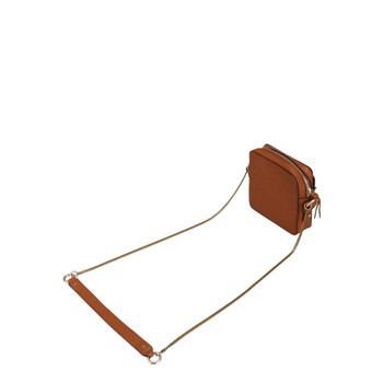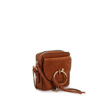 See By Chloe Ladies Shoulder Bag. SKU: CHS19SS994330242. Color: Caramel. Size: W 5.7" x H 5.7" x D 1.6". See By Chloe Small Joan Camera Bag. The Joan camera handbag, crafted from grained and suede cowhide, features a refined chain strap, a zipper top closure, gold brass finish, a main compartment, a cross-body chain-and-leather strap with a metal chain detail on the front, a flat pocket with a flap secured by an oversized round hook, and an interior card slot, with a strap length of 22.8 inches.