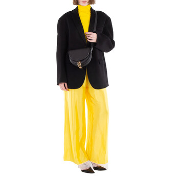 See By Chloe Ladies Shoulder Bag. SKU: CHS21WSB39388001. Color: Black. Size: 7.5" W x 7" H x 2.8". This Mara bag features a grained leather exterior with a canvas lining and gold-tone hardware, a flap top with a magnetic button closure, a main compartment with a flat pocket, a smaller front flat compartment, a chainlink detail with a debossed logo charm, an adjustable shoulder strap, and a detachable shoulder strap with a 16.5" drop. Outer: Calfskin.