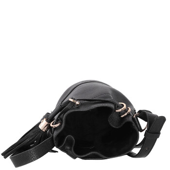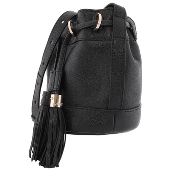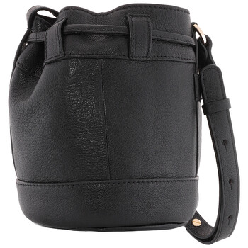 See By Chloe Ladies Bucket Bag. SKU: CHS23ASC13D38001. Color: Black. Size: W: 5.9" x H: 7.1" x D: 5.9". See By Chloe Small Vicki Leather Bucket Bag. The Vicki small bucket bag is crafted from grained goatskin, featuring a scaled-down design with a drawstring closure, a long adjustable strap, a main compartment, a card slot, leather tassels, gold brass hardware, and a cotton canvas lining. Max. strap drop: 21.3". Material: Goatskin.