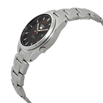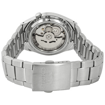 Stainless steel case with a stainless steel bracelet. Fixed stainless steel bezel. Black dial with luminous silver-tone hands and index hour markers. Arabic numeral minute markers (at 5 minute intervals). Minute markers around the outer rim. Dial Type: Analog. Luminescent hands and markers. Day of the week and date display at the 3 o'clock position. Seiko caliber 7S26 automatic movement, based upon Seiko 7002, containing 21 Jewels, bitting at 21600 vph, and has a power reserve of approximately 40 hours. Scratch resistant Hardlex crystal. Pull / push crown. Transparent case back. Round case shape. Case size: 37 mm. Case thickness: 11mm. Band width: 18 mm. Fold over clasp with a push button release. Water resistant at 30 meters / 100 feet. Functions: date, day, hour, minute, second. Seiko 5 Series. Casual watch style. Seiko 5 Automatic Black Dial Men's Watch SNK617K1.