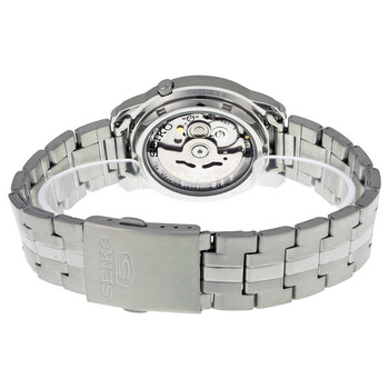 Stainless steel case with a stainless steel bracelet. Fixed stainless steel bezel. Black dial with luminous silver-tone hands and index hour markers. Minute markers around the outer rim. Dial Type: Analog. Luminescent hands and markers. Day of the week and date display at the 3 o'clock position. Seiko caliber 7S26 automatic movement with a 40-hour power reserve. Scratch resistant Hardlex crystal. Pull / push crown. Skeleton case back. Round case shape. Case size: 38 mm. Case thickness: 11 mm. Band width: 17.5 mm. Deployment clasp. Water resistant at 30 meters / 100 feet. Functions: date, day, hour, minute, second. Dress watch style. Watch label: Japan Movt. Seiko 5 Automatic Black Dial Stainless Steel Men's Watch SNKK71.