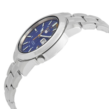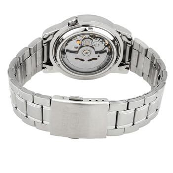 Silver-tone stainless steel case and bracelet. Fixed silver-tone stainless steel bezel. Blue dial with silver-tone hands and index hour markers. Dial Type: Analog. Luminescent hands and markers. Date display at the 3 o'clock position. Seiko Caliber 7S26 Automatic movement, based upon Seiko 7002, containing 21 Jewels, bitting at 21600 vph, and has a power reserve of approximately 40 hours. Scratch resistant mineral crystal. Pull / push crown. Transparent see through case back. Round case shape, case size: 37 mm, case thickness: 11 mm. Fold over clasp. Water resistant at 30 meters / 100 feet. Functions: day, date, hour, minute, second. 5 Series. Casual watch style. Watch label: Japan Made. Seiko 5 Automatic Blue Dial Men's Watch SNKK27K1.