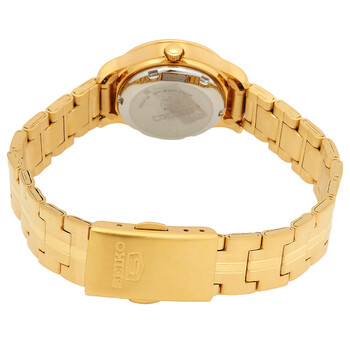 Gold-tone stainless steel case and bracelet. Fixed gold-tone stainless steel bezel. Gold-tone dial with gold-tone hands and Arabic numeral, index hour markers. Dial Type: Analog. Day & date display at the 3 o'clock position. Seiko Caliber 4207 Automatic movement, containing 21 Jewels, bitting at 21600 vph, and has a power reserve of approximately 24 hours. Scratch resistant Hardlex crystal. Solid case back. Round case shape, case size: 25 mm, case thickness: 10 mm. Deployment clasp. Water resistant at 30 meters / 100 feet. Functions: date, day, hour, minute, second. Seiko 5 Series. Casual watch style. Seiko Seiko 5 Automatic Gold Dial Ladies Watch SYME02K1.