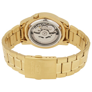 Yellow gold-tone stainless steel case and bracelet. Fixed yellow gold-tone bezel. Gold dial with luminous yellow gold-tone hands and index hour markers. Minute markers around the outer rim. Dial Type: Analog. Luminescent hands and markers. Day of the week and date display at the 3 o'clock position. Automatic movement. Scratch resistant Hardlex crystal. Pull / push crown. Transparent case back. Round case shape. Case size: 38 mm. Case thickness: 11 mm. Band width: 20 mm. Deployment clasp. Water resistant at 30 meters / 100 feet. Functions: date, day, hour, minute, second. 5 Series. Sport watch style. Seiko 5 Automatic Gold Dial Yellow Gold-tone Men's Watch SNKK20K1.