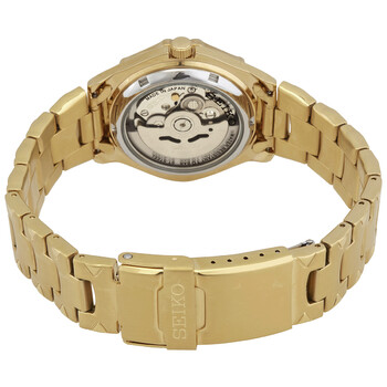 Yellow gold-tone stainless steel case and bracelet. Fixed yellow gold-tone bezel. Gold dial with luminous yellow gold-tone hands and dot hour markers. Arabic numerals appear at the 6 and 12 o'clock positions. Minute markers. Dial Type: Analog. Luminescent hands and markers. Day of the week and date display at the 3 o'clock position. Caliber: 7S36 automatic movement with a 41-hour power reserve. Scratch resistant mineral crystal. Pull / push crown. Transparent case back. Round case shape. Case size: 38 mm. Case thickness: 12 mm. Band width: 20 mm. Fold over clasp with a push button release. Water resistant at 100 meters / 330 feet. Functions: date, day, hour, minute, second. Seiko 5 Series. Casual watch style. Watch label: Japan Movt. Seiko 5 Automatic Gold Dial Yellow Gold-tone Men's Watch SNZ460J1.