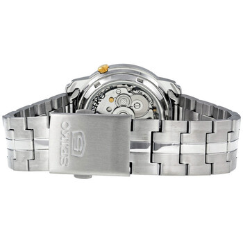 Stainless steel case with a stainless steel bracelet. Fixed stainless steel bezel. Gray dial with luminous yellow gold-tone hands and index hour markers. Minute markers around the outer rim. Dial Type: Analog. Luminescent hands and markers. Day of the week and date display at the 3 o'clock position. Caliber: 7S26 automatic movement with a 40-hour power reserve. Scratch resistant Hardlex crystal. Pull / push crown. Skeleton case back. Round case shape. Case size: 38 mm. Case thickness: 12 mm. Band width: 17 mm. Fold over clasp. Water resistant at 30 meters / 100 feet. Functions: date, day, hour, minute, second. Casual watch style. Watch label: Japan Movt. Seiko 5 Automatic Grey Dial Stainless Steel Men's Watch SNKK67.