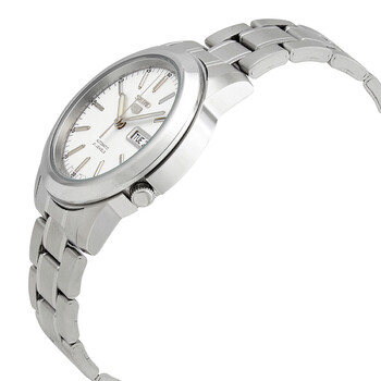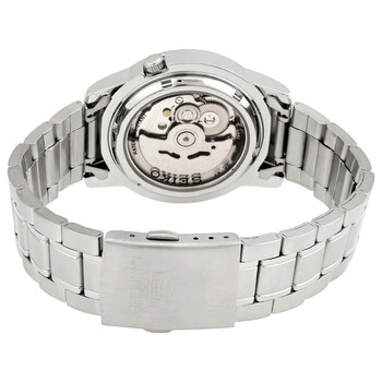 Stainless steel case and bracelet. Fixed stainless steel bezel. Off white dial with luminous silver-tone hands and index hour markers. Arabic numeral minute markers (at 5 minute intervals). Minute markers around the outer rim. Dial Type: Analog. Luminescent hands and markers. Day of the week and date display at the 3 o'clock position. Seiko caliber 7S26 automatic movement, based upon Seiko 7002, containing 21 Jewels, bitting at 21600 vph, and has a power reserve of approximately 40 hours. Scratch resistant Hardlex crystal. Pull / push crown. Skeleton case back. Round case shape. Case size: 39 mm. Case thickness: 11 mm. Band width: 18 mm. Band length: 9 inches. Fold over clasp with a push button release. Water resistant at 30 meters / 100 feet. Functions: date, day, hour, minute, second. Seiko 5 Series. Casual watch style. Watch label: Japan Movt. Item Variations: SNKE49, SNKE49J1. Seiko Seiko 5 Automatic Men's Watch SNKE49K1.