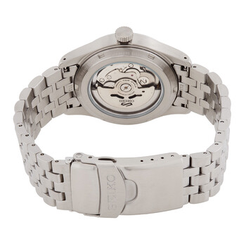 Silver-tone stainless steel case and bracelet. Fixed silver-tone stainless steel bezel. Beige dial with luminous blue hands and index-Arabic numeral hour markers. Minute scale around the inner rim. Dial Type: Analog. Luminescent hands and markers. Day and date display at the 3 o'clock position. Seiko Caliber 4R36 Automatic movement, containing 24 Jewels, bitting at 21600 vph, and has a power reserve of approximately 41 hours. Scratch resistant mineral crystal. Pull / push crown. Transparent see through case back. Round case shape, case size: 39.4 mm, case thickness: 13.1 mm. Band width: 20 mm. Deployment with push button release clasp. Water resistant at 100 meters / 330 feet. Functions: date, day, hour, minute, second. Seiko 5 Series. Sport watch style. Watch label: Japan Movt. Seiko Seiko 5 Automatic Men's Watch SRPK41K1.