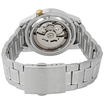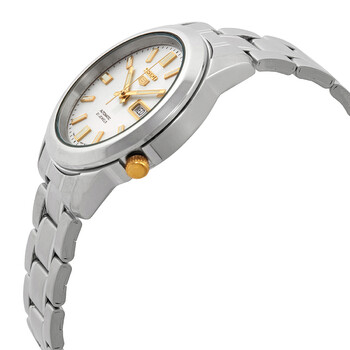 Stainless steel case with a stainless steel bracelet. Fixed stainless steel bezel. Silver-tone dial with luminous gold-tone hands and index hour markers. Minute markers around the outer rim. Dial Type: Analog. Luminescent hands and markers. Day of the week and date display at the 3 o'clock position. Seiko caliber 7S26 automatic movement, based upon Seiko 7002, containing 21 Jewels, bitting at 21600 vph, and has a power reserve of approximately 40 hours. Scratch resistant Hardlex crystal. Pull / push crown. Transparent case back. Round case shape. Case size: 39.5 mm. Case thickness: 11 mm. Band width: 19 mm. Fold over clasp with a push button release. Water resistant at 30 meters / 100 feet. Functions: date, day, hour, minute, second. Seiko 5 Series. Casual watch style. Seiko 5 Automatic Silver Dial Men's Watch SNKK09K1.