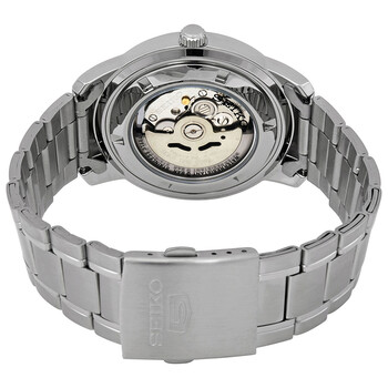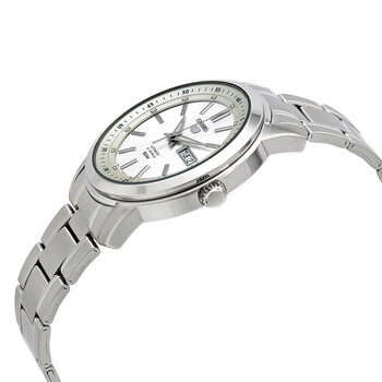 Stainless steel case with a stainless steel bracelet. Fixed smooth stainless steel bezel. White dial with luminous silver-tone dauphine-style hands and index hour markers. Minute markers around the outer rim. Dial Type: Analog. Luminescent hands. Day of the week and date display at the 3 o'clock position. Seiko caliber 7S26 automatic movement, based upon Seiko 7002, containing 21 Jewels, bitting at 21600 vph, and has a power reserve of approximately 40 hours. Scratch resistant mineral crystal. Pull / push crown. Transparent case back. Round case shape. Case size: 43 mm. Case thickness: 12 mm. Band width: 22 mm. Fold over clasp with a push button release. Water resistant at 50 meters / 165 feet. Functions: date, day, hour, minute, second. Series 5 Series. Casual watch style. Watch label: Japan Movt. Seiko 5 Automatic White Dial Men's Watch SNKM83K1.