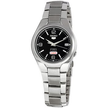 Stainless steel case with a stainless steel bracelet. Fixed stainless steel bezel. Black dial with luminous silver-tone hands and index hour markers. Arabic numerals mark the 6, 9 and 12 o'clock positions. Minute markers around the outer rim. Dial Type: Analog. Luminescent hands and markers. Date display at the 3 o'clock position. Day of the week display above the 6 o'clock position. Seiko caliber 7S26 automatic movement, based upon Seiko 7002, containing 21 Jewels, bitting at 21600 vph, and has a power reserve of approximately 40 hours. Scratch resistant Hardlex crystal. Pull / push crown. Screw down transparent case back. Round case shape. Case size: 38 mm. Case thickness: 11 mm. Band width: 18 mm. Fold over clasp with a push button release. Water resistant at 30 meters / 100 feet. Functions: date, day, hour, minute, second. Casual watch style. Seiko 5 Black Dial Stainless Steel Men's Watch SNK623.