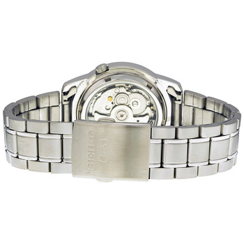 Stainless steel case with a stainless steel bracelet. Fixed smooth stainless steel bezel. Blue dial with luminous silver-tone arrow-shaped hands and index hour markers. Arabic numeral minute markers (at 5 minute intervals). Minute markers around the outer rim. Dial Type: Analog. Luminescent hands and markers. Day of the week and date display at the 3 o'clock position. Seiko caliber 7S26 automatic movement, based upon Seiko 7002, containing 21 Jewels, bitting at 21600 vph, and has a power reserve of approximately 40 hours. Scratch resistant Hardlex crystal. Pull / push crown. Skeleton case back. Round case shape. Case size: 38 mm. Case thickness: 12 mm. Band width: 20 mm. Fold over clasp. Water resistant at 30 meters / 100 feet. Functions: date, day, hour, minute, second. Sport Series. Sport watch style. Watch label: Japan Movt. Seiko 5 Blue Automatic Blue Dial Men's Watch SNKK27.
