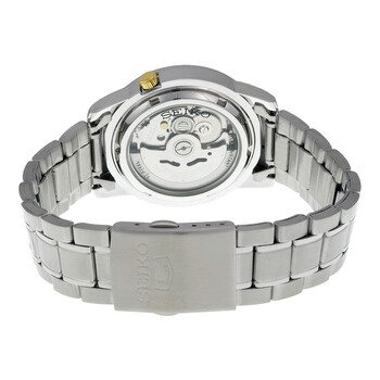 Stainless steel case with a stainless steel bracelet. Fixed stainless steel bezel. Silver dial with luminous gold-tone hands and stick hour markers. Minute markers around the outer rim. Dial Type: Analog. Luminescent hands and markers. Day of the week and date display at the 3 o'clock position. Automatic movement. Scratch resistant Hardlex crystal. Push / pull crown. Skeleton case back. Case diameter: 38 mm. Case thickness: 11 mm. Fold over clasp with a push button release. Water resistant at 30 meters / 100 feet. Functions: date, day, hour, minute, second. Dress watch style. Seiko 5 Silver Stainless Steel Automatic Men's Watch SNKK09.
