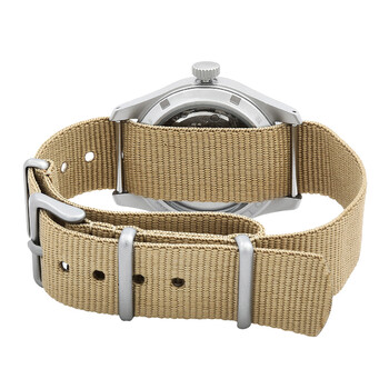 Silver-tone stainless steel case with a beige nylon strap. Fixed silver-tone stainless steel bezel. Beige dial with black hands and Arabic numeral hour markers. Minute markers around the outer rim. Dial Type: Analog. Luminescent hands and markers. Day of the week and date display at the 3 o'clock position. Seiko Caliber 4R36 Automatic movement, containing 24 Jewels, bitting at 21600 vph, and has a power reserve of approximately 41 hours. Scratch resistant curved Hardlex crystal. Transparent case back. Round case shape, case size: 36.4 mm, case thickness: 12.5 mm. Band width: 18 mm. Tang clasp. Water resistant at 100 meters / 330 feet. Functions: date, day, hour, minute, second. 5 Sports Series. Sport watch style. Watch label: Japan Movt. Seiko 5 Sports Automatic Beige Dial Men's Watch SRPJ83K1.