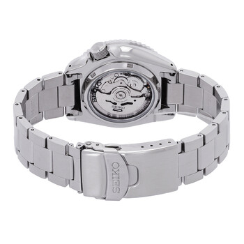 Stainless steel case with a stainless steel bracelet. Uni-directional rotating stainless steel bezel with a black ring. Black dial with luminous silver-tone hands and dot hour markers. Minute markers around the outer rim. Dial Type: Analog. Luminescent hands and markers. Date and day of the week display at the 3 o'clock position. Automatic movement. Scratch resistant Hardlex crystal. Screw down crown. Round case shape. Case size: 42.5 mm. Case thickness: 13 mm. Band width: 22 mm. Fold over clasp with a safety release. Water resistant at 100 meters / 330 feet. Functions: date, day, hour, minute, second. Seiko 5 Sports Series. Sport watch style. Watch label: Japan Movt. Seiko 5 Sports Automatic Black Dial Men's Watch SRPD55K1.