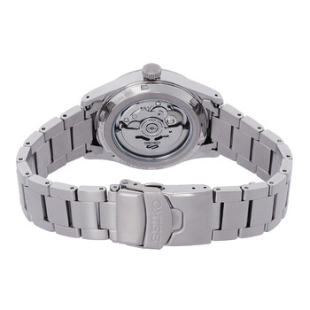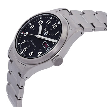 Silver-tone stainless steel case and bracelet. Fixed silver-tone stainless steel bezel. Black dial with silver-tone hands and Arabic numeral hour markers. Minute markers around the outer rim. Dial Type: Analog. Luminescent hands and markers. Day of the week and date display at the 3 o'clock position. Seiko Caliber 4R36 Automatic movement, containing 24 Jewels, bitting at 21600 vph, and has a power reserve of approximately 41 hours. Transparent see through case back. Round case shape, case size: 39.4 mm. Fold over clasp with a safety release. Water resistant at 100 meters / 330 feet. Functions: date, day, hour, minute, second. 5 Sports Series. Casual watch style. Watch label: Japan Movt. Seiko 5 Sports Automatic Black Dial Men's Watch SRPG27.